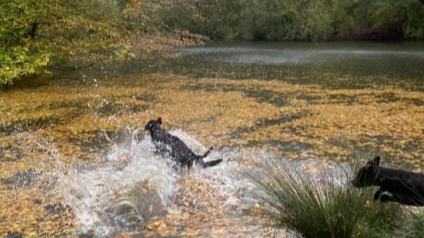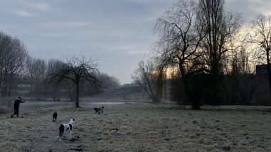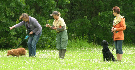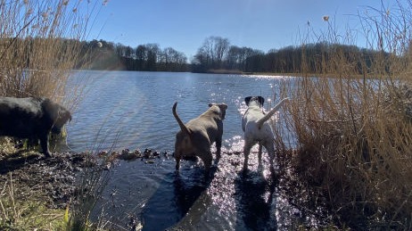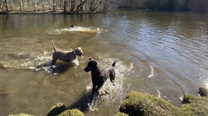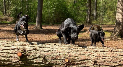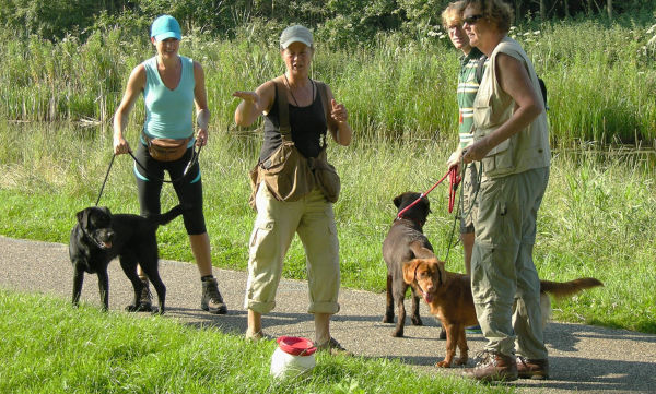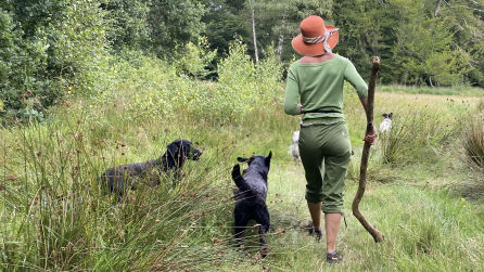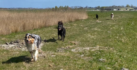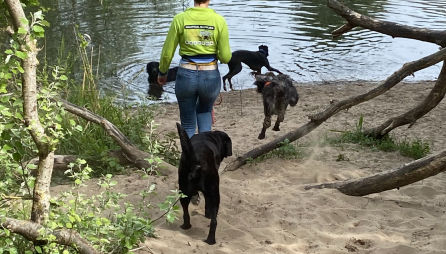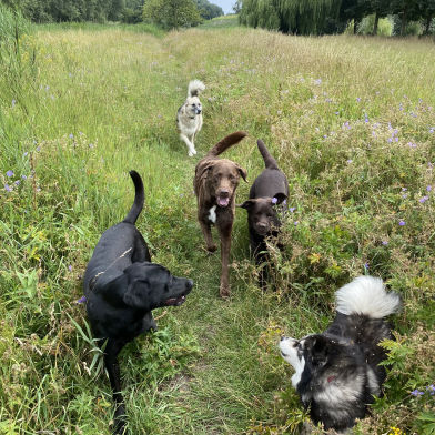 In plaats van korte rondjes door de wijk maken we lange, gevarieerde wandelingen in een groot, groen losloopgebied met bos, water en weide.