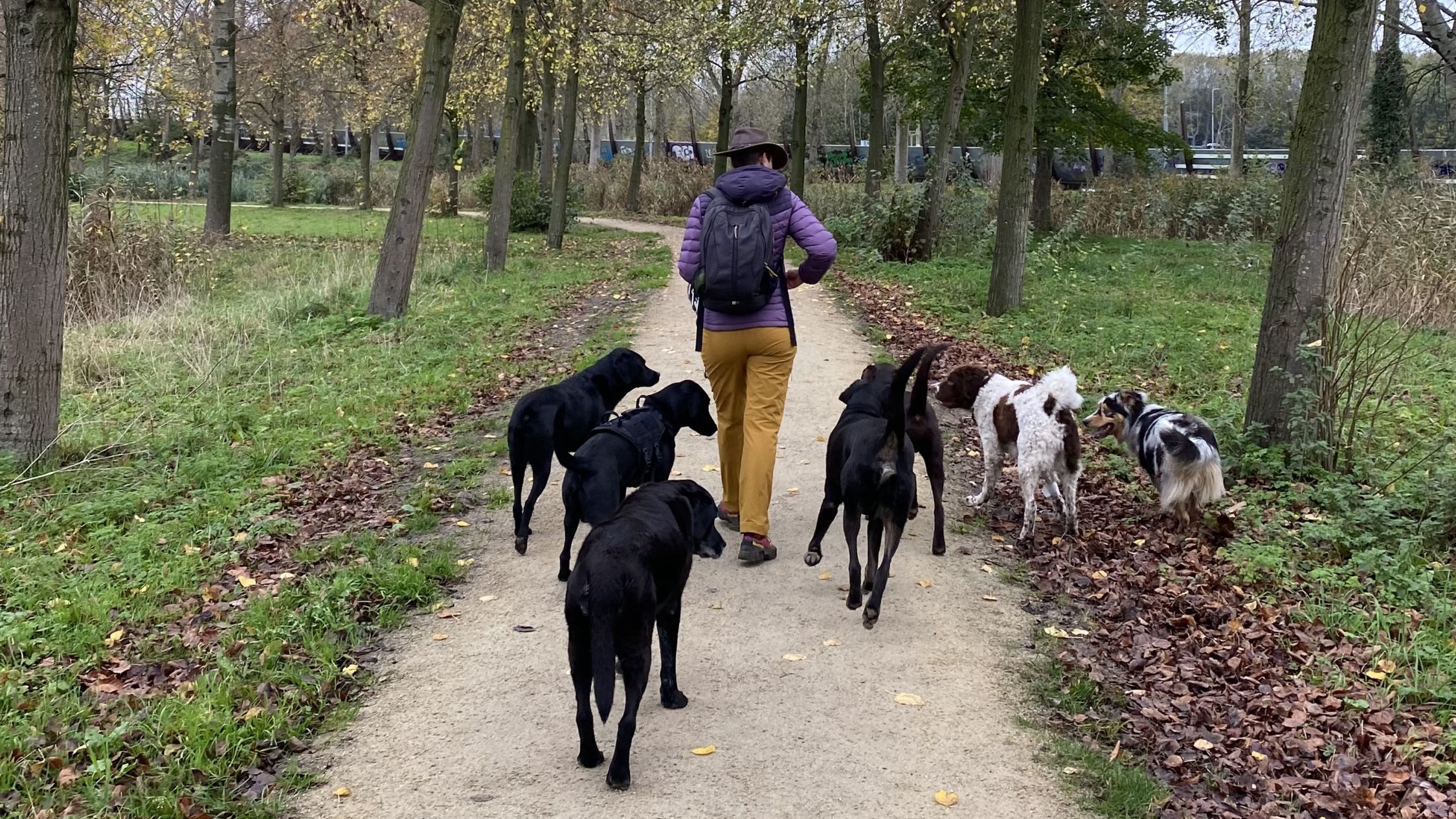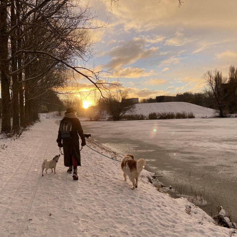 Our walks last at least 90 minutes, so dogs get enough movement and time to sniff and explore.